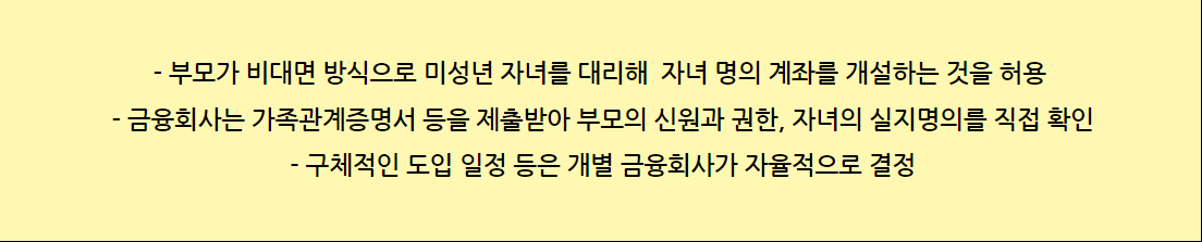 보통 금융회사는 부모의 신분증, 부모 및 미성년 자녀의 가족관계증명서를 지참해야 합니다.